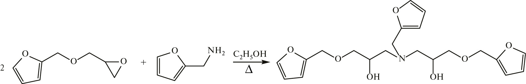 Трифурандиол (ТФ) синтезировали согласно модифицированной известной методике [25]. Смесь 21.6 мл (157.7 ммоль) ФГЭ и фурфуриламина (6.34 мл, 71.7 ммоль) в 40 мл толуола кипятили в течение 4 ч, ход реакции отслеживали методом ИК-спектроскопии (по исчезновению полос при 952 и 938 см–1, соответствующих оксирановому циклу ФГЭ, 1600 и 3300 см–1 – валентным и деформационным колебаниям аминогруппы, а также появлению полосы при 3500 см–1 для спиртовой группы). Растворитель удаляли при пониженном давлении, остаток фильтровали через слой активированного угля и переосаждали в системе диэтиловый эфир/гексан для отделения смолистых побочных продуктов. Выход составил 96%. ЯМР 1H (300 МГц, CDCl3): 7.39 (дд, JHH = 1.7, 0.8 Гц, 2H, =CHO, фурановое кольцо), 7.35–7.33 (м, 1H, =CHO, фурановое кольцо), 6.30–6.27 (м, 5H, =CH–CH=, фурановый цикл), 6.16 (д, JHH = 2.9 Гц, 1H, =CH–CH=, фурановый цикл), 4.47 (с, 4H, –O–CH2–C), 3.88–3.78 (м, 2H, –(CH2)CH–OH), 3.72 (д, JHH = 5.2 Гц, 2H, –N–CH2–C–), 3.51–3.36 (м, 4H, –(OH)CH–CH2–O–), 2.69–2.51 (м, 4H, CH–CH2–N(CH2)–). ИК (НПВО, пленка, см–1): 3500 (OH), 3117(=CH), 2905, 2860, 1504, 1451, 1357 (третичная аминогруппа), 1278, 1227, 1148, 1077, 1013 (фурановый цикл), 921, 883, 809, 735 (С=С, фурановый цикл).
