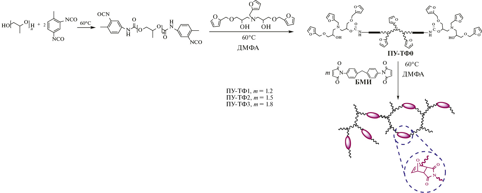 Фурфурол (99.5%, “Компонент-Реактив”) очищали перегонкой в вакууме. ППГ 2000 (полипропиленгликоль с Mn = 2000, “Aldrich”) сушили в вакууме (20 мбар) в течение 2 ч при 110 °C. Фурфуриламин (“Aldrich”) и ФГЭ (“Acros”) очищали перегонкой в вакууме (35 °C, 15 мбар и 100 °C, 10 мбар соответственно). ДМФА (“Acros”) сушили над гидридом кальция и перегоняли в вакууме (50 °C, 20 мбар), толуол сушили над гидридом кальция и перегоняли. 2,4-Толуилендиизоцианат (ТДИ), 80% 2,4-изомера, “Aldrich”) перегоняли в вакууме (126 °С/11 мбар) и вымораживали для отделения 2,6-изомера, 2,6-ди-трет-бутил-4-метилфенол (BHT, 99.0%, “Acros”) и 1,10-(метиленди-1,4-фенилен)бисмалеимид (БМИ 95%, “Aldrich”) использовали без дополнительной очистки.