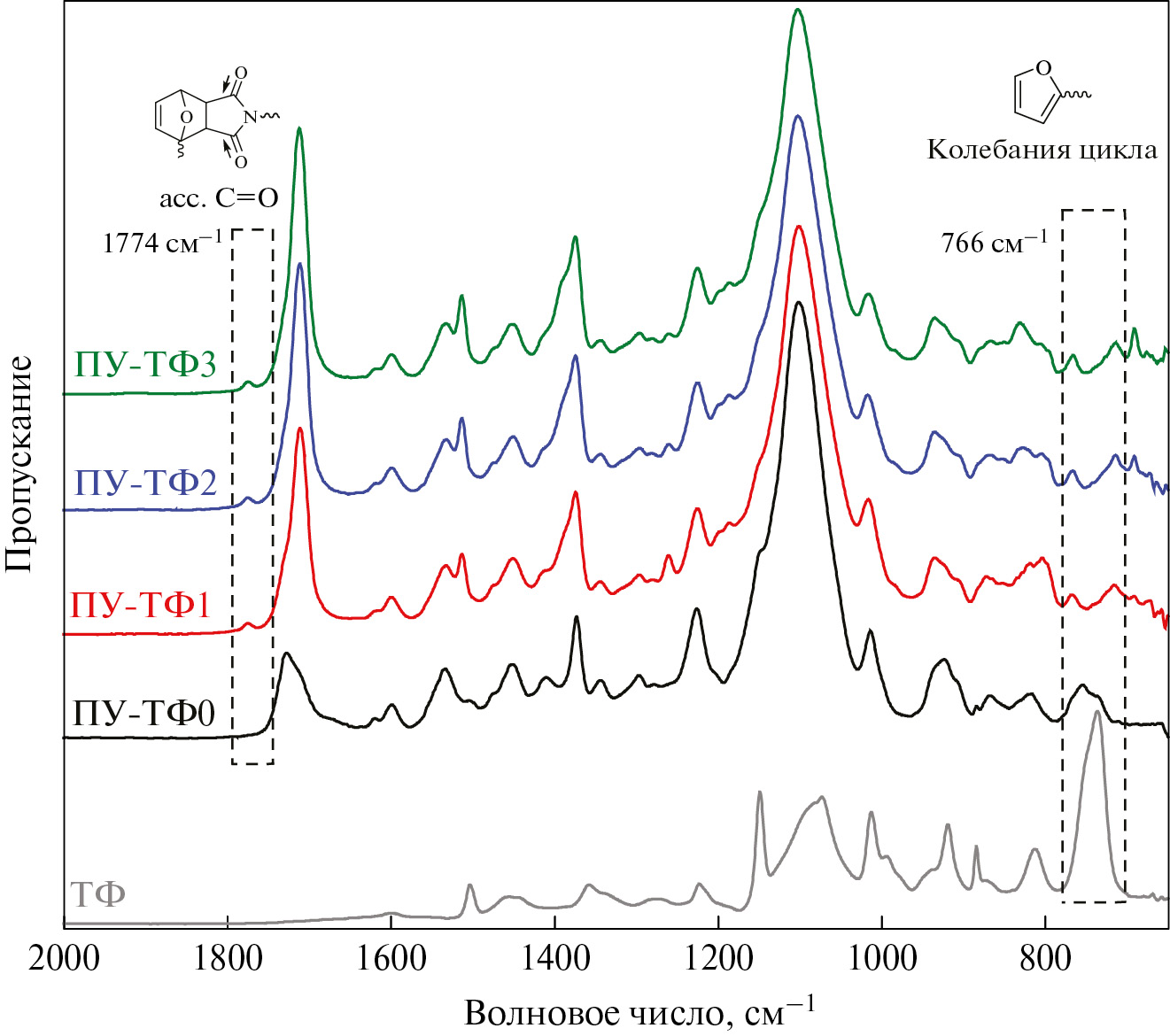 В ИК-спектрах ПУ-ТФ1, ПУ-ТФ2 и ПУ-ТФ3 наблюдалось уменьшение интенсивности характеристической полосы деформационных колебаний фуранового цикла при 766 см–1 и появление слабой полосы карбонильных групп в бициклическом ДА-аддукте при 1774 см–1, что также указывало на успешное отверждение и образование ДА-аддуктов [30, 31]. Полосу групп C=O при 1714 см–1 можно отнести к частично непрореагировавшим малеимидным группам и уретановым фрагментам.
