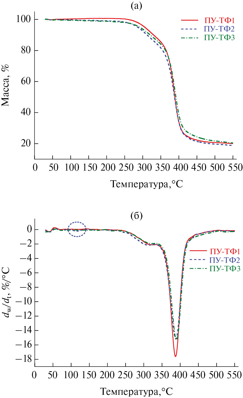 Все полимеры ряда ПУ-ТФ1, ПУ-ТФ2 и ПУ-ТФ3 обладали довольно хорошей термической стойкостью и показали медленную потерю массы в интервале 260–360 °C (15.9, 17.3 и 20.7% для ПУ-ТФ1, ПУ-ТФ2 и ПУ-ТФ3 соответственно). Основная потеря массы наблюдается в интервале 370–450 °C и составляет 77.8, 78.7 и 75.4% для полиуретанов ПУ-ТФ1, ПУ-ТФ2 и ПУ-ТФ3. Образцы ПУ-ТФ1, ПУ-ТФ2 и ПУ-ТФ3 не показали явной тенденции к росту зольного остатка и температур разложения. На кривых ДТГ (рис. 2) присутствуют максимумы в области 387–391 °C, соответствующие потере массы в результате термического разложения фурансодержащего преполимера. Небольшие пики при 110–150 °C могут быть связаны с испарением следовых количеств ДМФА в материале (в ИК-спектрах сигналы ДМФА не проявляются). Кривые ТГА исходных и переработанных образцов практически идентичны, что свидетельствует о том, что переработка не влияет на термостабильность полученных полиуретанов.