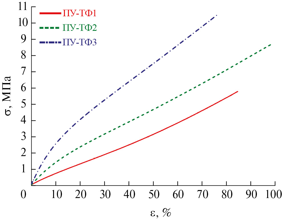 Рис. 6. Типичные диаграммы нагружения ПУ-ТФ1 (1), ПУ-ТФ2 (2) и ПУ-ТФ3 (3).