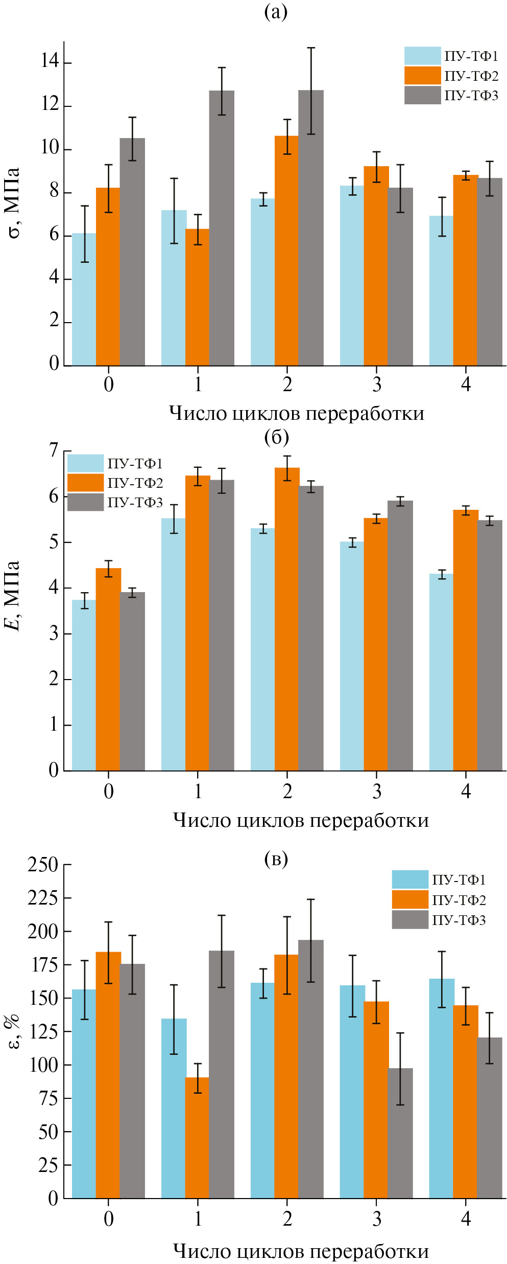 Рис. 7. Изменение предела прочности (а), модуля упругости (б) ПУ-ТФ1 (1), ПУ-ТФ2 (2), ПУ-ТФ3 (3) в ходе вторичной переработки, и относительного удлинения образцов ПУ-ТФ1 (1), ПУ-ТФ2 (2) и ПУ-ТФ3 (3) в процессе циклической переработки (в).