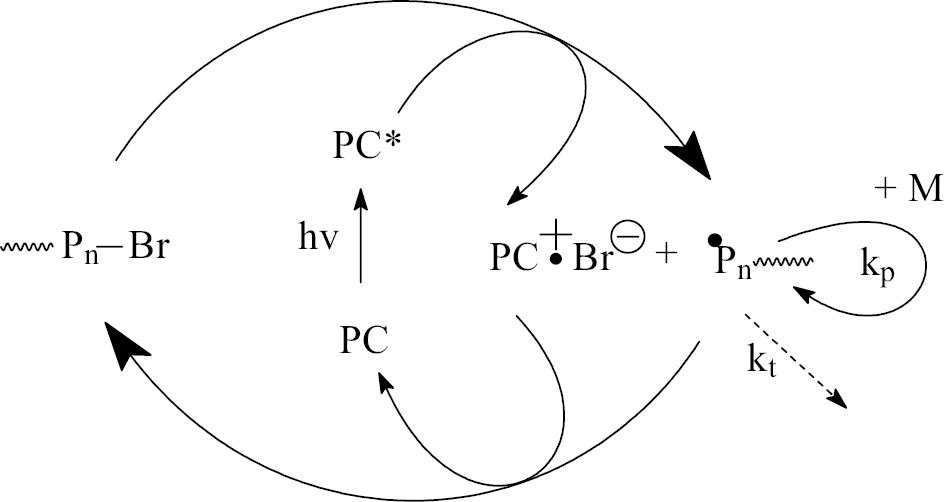 где PC – фотокатализатор, ~Pn–Br – “спящая” цепь.