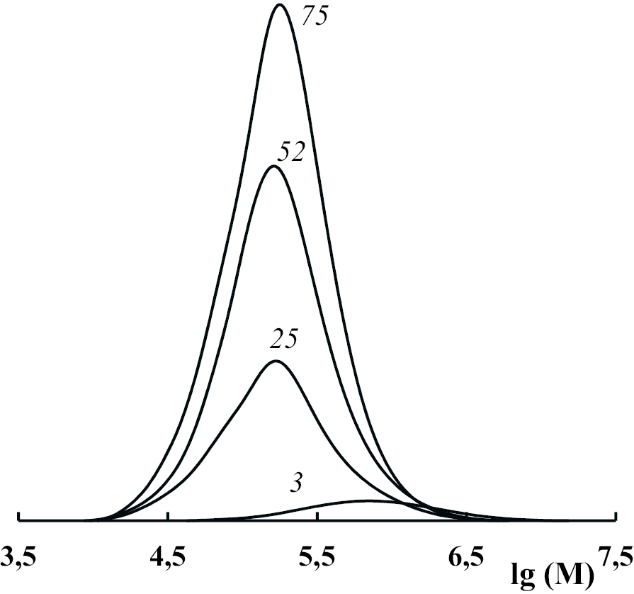 Рис. 4. Кривые ММР образцов ПММА с нормировкой на конверсию (цифры у кривых). Концентрация t-BuBr 1 мол. %; дегазации нет; объемное соотношение ММА : ДМСО = 1 : 1; облучение светом с λмакс ~ 365 нм