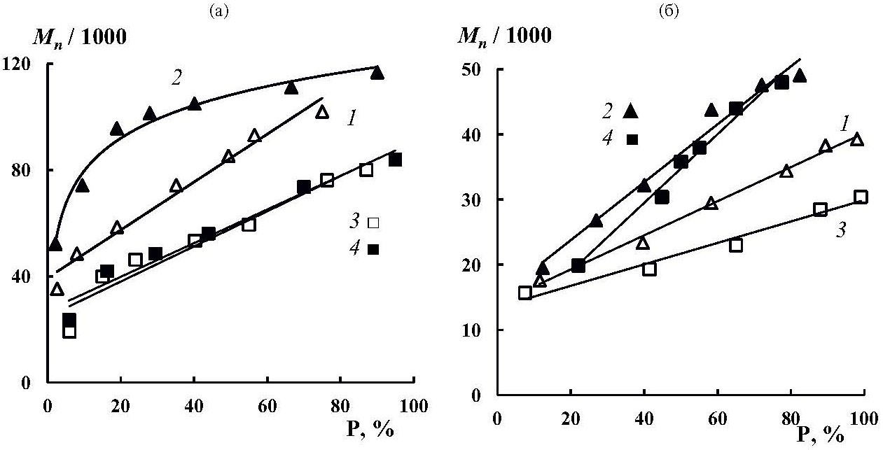 Рис. 5. Зависимости Mn (а) и Đ (б) образцов ПММА от конверсии мономера. Облучение светом с λмакс ~ 365 нм; объемное соотношение ММА : ДМСО = 1 : 1; инициатор t-BuBr (а) и CBr4 (б); соотношение ММА : инициатор : феназин : Bu3N = 100 : 1 : 0.01 : 0 (1, 2) и 100 : 1 : 0.01 : 0.5 (3, 4); дегазация: 1, 3 – есть, 2, 4 – нет