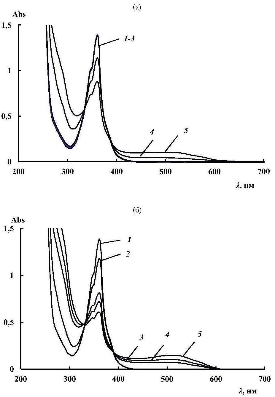 Рис. 7. Спектры поглощения растворов феназина в этилацетате. Облучение светом с λмакс ~ 365 нм; концентрация феназина в этилацетате 0.017 мг/мл; мольное соотношение феназин : t-BuBr : Bu3N = 1 : 100 : 50. 1 – до облучения; 2, 3 – после облучения в присутствии t-BuBr (а) и Bu3N (б) в течение 10 (2) и 30 мин (3); 4, 5 – после добавления Bu3N (а) и t-BuBr (б) и облучения в течение 10 (4) и 30 мин (5)