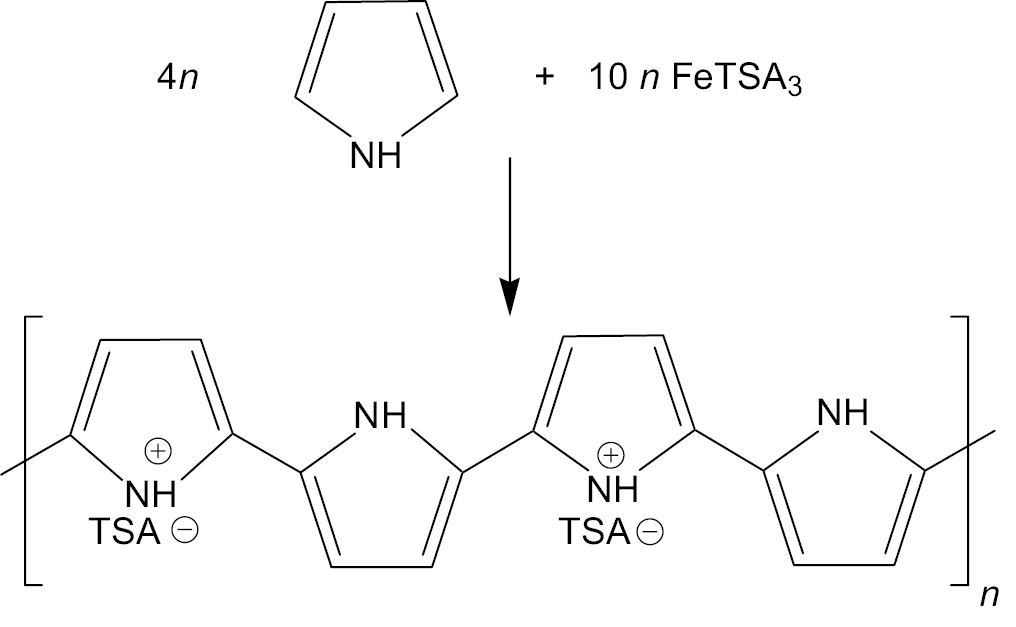 В нашем случае Т-ПП получали, нанося полипиррол на текстиль методом гетерофазного синтеза – окислительной полимеризации пиррола в присутствии текстиля. Как показали предварительные исследования, метод позволяет сформировать однородный слой полипиррола на поверхности волокон во всем объеме текстиля и обеспечивает хорошую адгезию полипиррола к их поверхности [43]. Окислительная полимеризация пиррола может протекать как в жидкой, так и в газовой фазе. При получении Т-ППи полимеризация осуществлялась из паровой фазы пиррола. Реакция шла на поверхности волокон текстиля, предварительно импрегнированного окислителем (Fe-ТSA3). Уравнение окислительной полимеризации пиррола можно записать в общем виде: