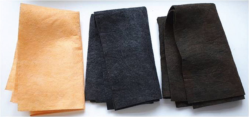 В работе использовали коммерческий нетканый текстиль из вискозы и полиэфирных волокон (60/40%), он выпускается различными производителями России. Образцы ткани размерами 50 × 60 см, натянутые на каркас, обрабатывали раствором солей трехвалентного железа (тосилат железа), который в качестве допирующей добавки содержал соляную кислоту. Обработку проводили при комнатной температуре в течение нескольких часов, после чего текстиль подсушивали и вносили в камеру с парами пиррола. Окислительная полимеризация пиррола протекала здесь при температуре 45 °С в течение 6 ч. Затем модифицированные полипиррол и получившие черную окраску образцы текстиля многократно промывали дистиллированной водой и сушили на воздухе в растянутом на каркасе состоянии. Высаживание частиц магнетита на композиционный текстиль Т-ППи осуществляли путем соосаждения солей двух- и трехвалентного железа [39].