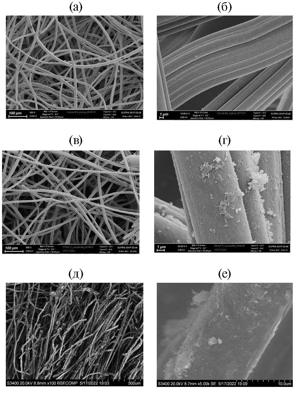 Рис. 3. Изображения образцов, полученные методом сканирующей электронной микроскопии: а, б – исходный текстиль Т; в, г – текстиль после модификации полипирролом Т-ППи; д, е – текстиль после высаживания на поверхность полипиррола магнетита Т-ППи-Fe3O4