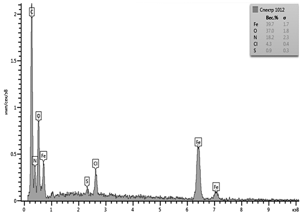 На рис. 5 приведены данные о качественном элементном составе композиционного текстиля Т-ППи-Fe3O4, которые получены методом энергодисперсионного анализа (energy dispersive X-ray analysis). Видно, что в композиционном материале присутствует весь набор элементов, соответствующий составляющим его компонентам: это исходный текстиль (C, O), допированный полипирролом (C, N, S, Cl), и магнетит (Fe, O).