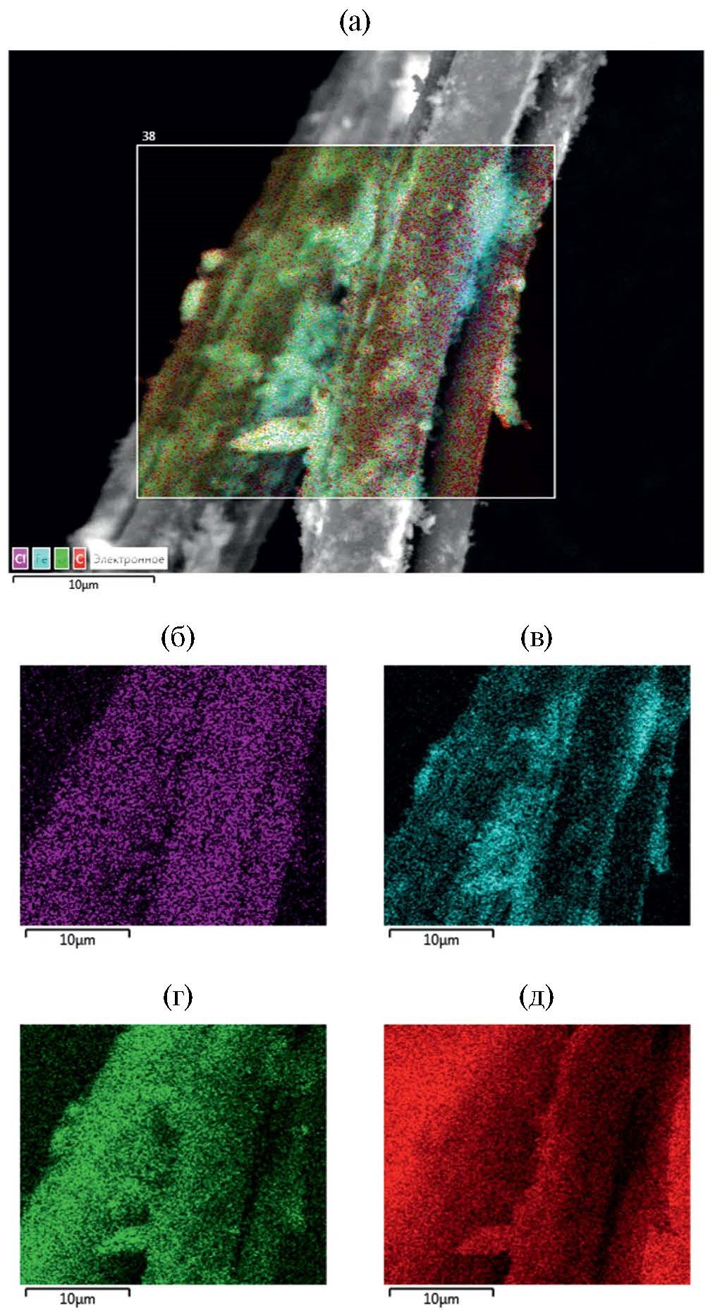 Элементный анализ подкреплен картированием обнаруженных элементов. На рис. 6 и 7 представлены поэлементные карты исследованных образцов исходной ткани и Т-ППи-Fe3O4. Распределение по элементам в них равномерное, кроме железа, что свидетельствует о кластеризации магнетита в отдельные частицы, прикрепленные к волокнам материала. Это также можно наблюдать и на микрофотографиях электронной микроскопии (рис. 3д, 3е).
