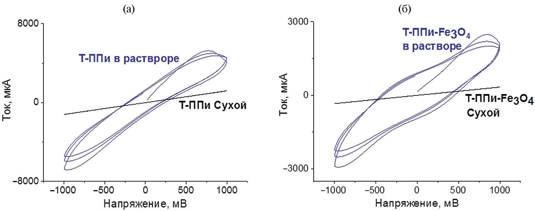 Рис. 9. Вольт-амперные характеристики Т-ППи (а) и Т-ППи-Fe3O4 (б) в сухом состоянии (1) и в физиологическом растворе (0.9 мас. % NaCl) (2)