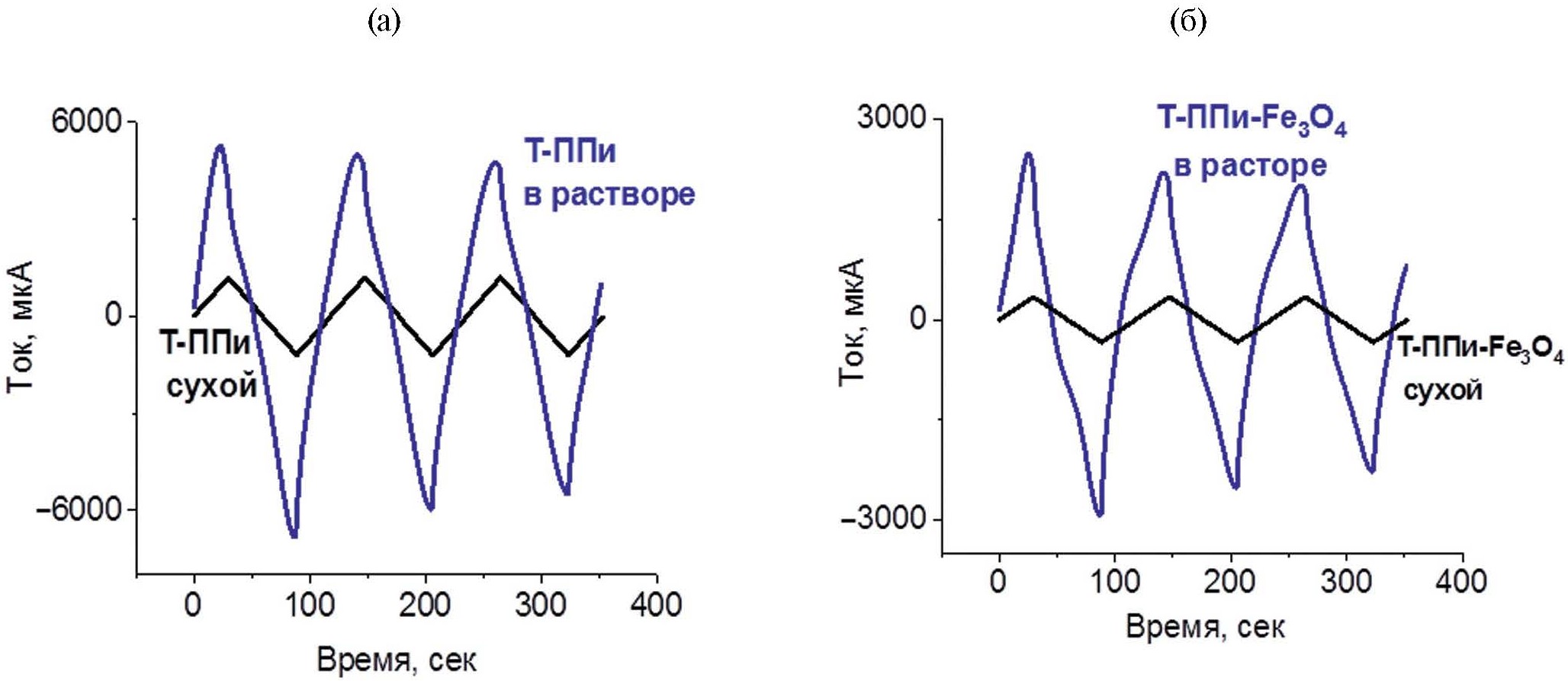 Рис. 10. Временная зависимость тока при наложении на образцы Т-ППи (а) и Т-ППи-Fe3O4 (б) переменного напряжения в диапазоне ±1.0 В со сменой полярности каждые 60 с: а – в сухом состоянии, б – в растворе