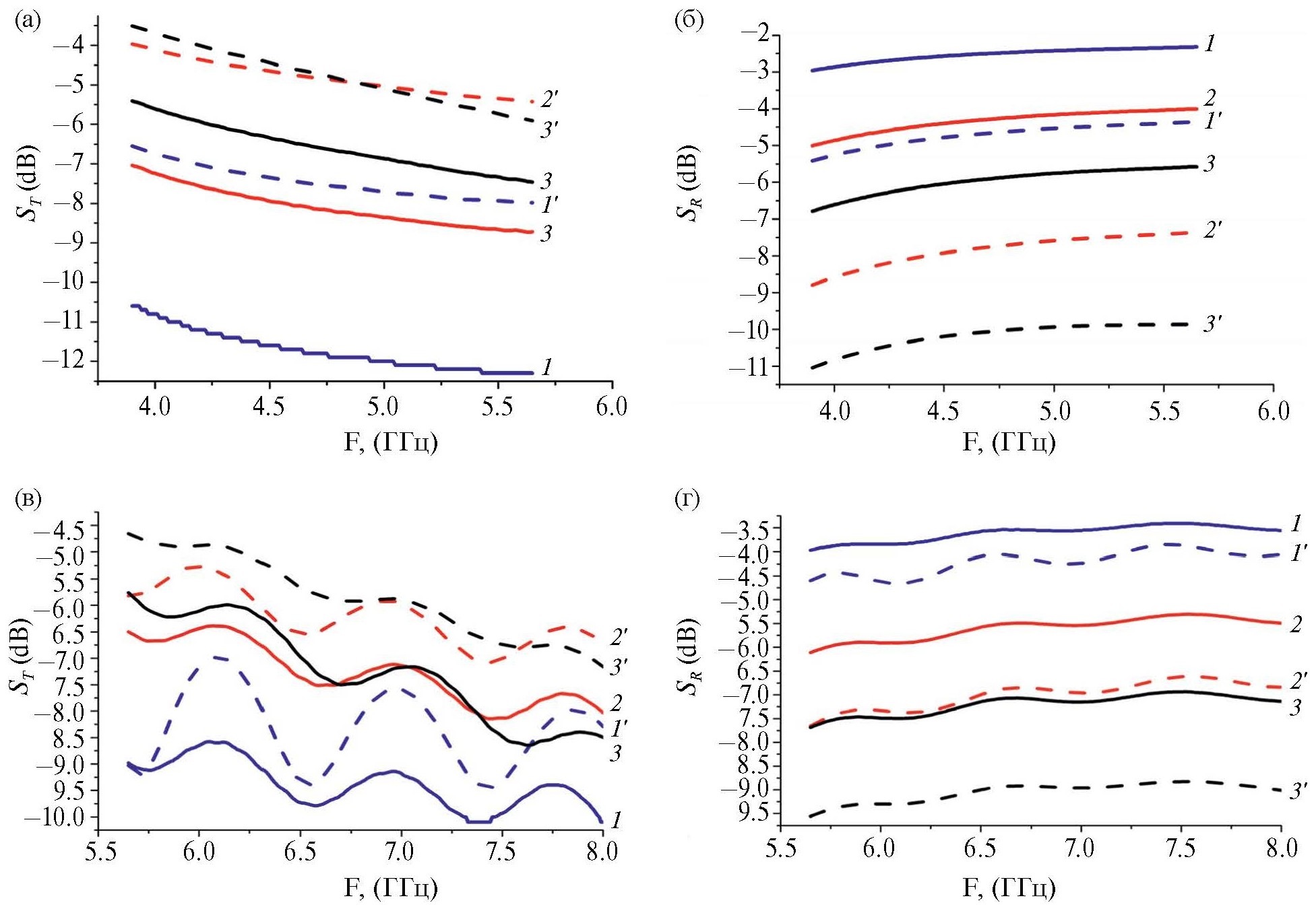 Рис. 11. Частотная зависимость параметров ST (а, в) и SR (б, г) для диапазона 3.9–5.65 (а, б) и 5.65–8 ГГц (в, г). Толщина образцов 2 (1, 1’), 4 (2, 2’) и 6 мм (3, 3’). Сплошные линии – Т-ППи, штриховые – Т-ППи-Fe3O4