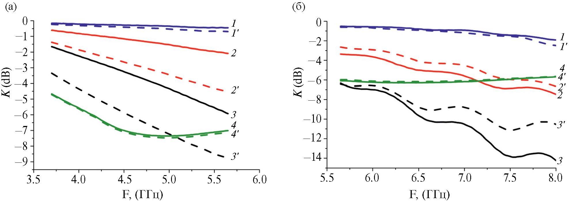 Рис. 12. Частотная зависимость коэффициента поглощения K для образцов Т-ППи (1–3) и Т-ППи-Fe3O4 (1’–3’) в сравнении с параметрами ПЭВ-Л (4, 4’) в диапазонах частот 3.9–5.65 (а) и 5.65–8 ГГц (б). Толщина образцов 2 (1, 1’), 4 (2, 2’, 4) и 6 мм (3, 3’, 4’)