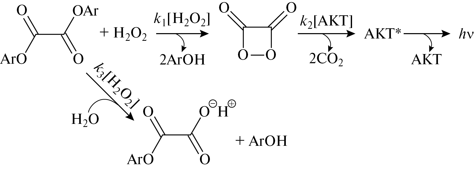 где концентрация оксалата определена как [Ox]0, пероксида водорода [H2O2]0, активатора [A] и локальная концентрация воды [H2O]; k1 – константа скорости циклизации, приводящая к образованию 1,2-диоксетандиона, k2 – константа скорости разложения 1,2-диоксетандиона с образованием активатора в возбужденном состоянии, k3 – константа скорости гидролиза оксалата; ϕ – квантовый выход люминесценции активатора, Φ – квантовый выход образования 1,2-диоксетандиона.