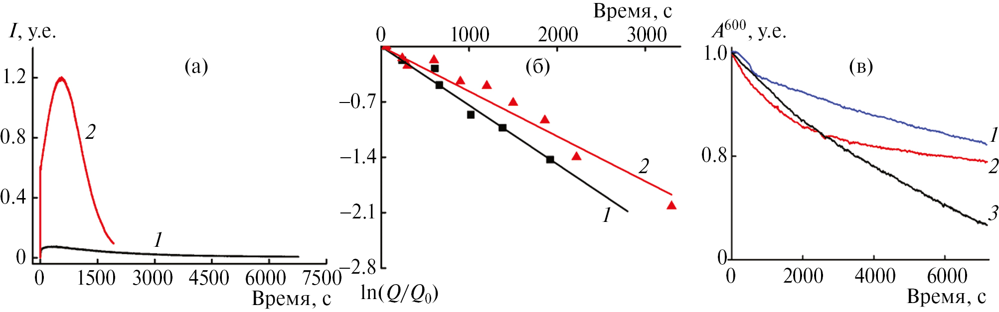 Рис. 2. Кинетика испускания хемилюминесценции в ходе ПО-реакции (a) и гидролиза (б) БТЭЭ-оксалата (1) и CPPO (2) в эмульсии диметилфталат/плюроник L64, содержащей 5 мг/мл диметилфталата, 1.25 мг/мл плюроника L64, 4.5 × 10–3 моль/л одного из оксалатов, 1 × 10–4 моль/л перилена и 4 × 10–4 моль/л H2O2, PBS, 37 °C; в ‒ изменение мутности при 600 нм чистой эмульсии (1), эмульсии с 1 × 10–4 моль/л перилена и 4.5 × 10–4 моль/л CPPO (2), и с 4.5 × 10–4 моль/л БТЭЭ-оксалата (3)