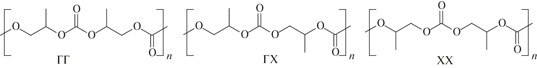 Согласно данным спектроскопии ЯМР (рис. 3а), ППК содержит исключительно карбонатные звенья; на это указывают сигналы при 4.98, 4.27–4.10 и 1.31 м.д. в спектре ЯМР 1Н. В спектре ЯМР 13С (рис. 3б) проявляются сигналы звеньев, соединенных голова–голова (~153.8–153.9 м.д.), голова–хвост (~154.2–154.3 м.д.) и хвост–хвост (~154.8 м.д.):