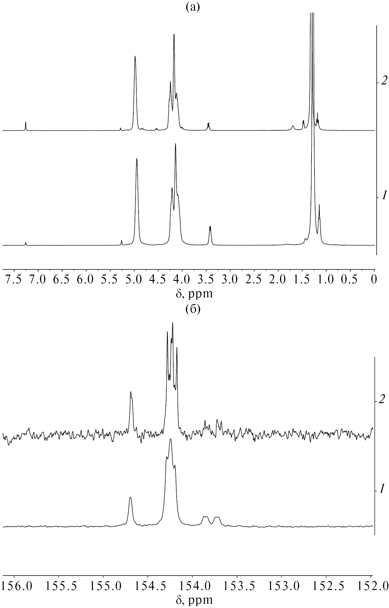 Рис. 3. Спектры ЯМР 1Н (а) и ЯМР 13С (б) ППК в CDCl3; 1 – П1, 2 – П2