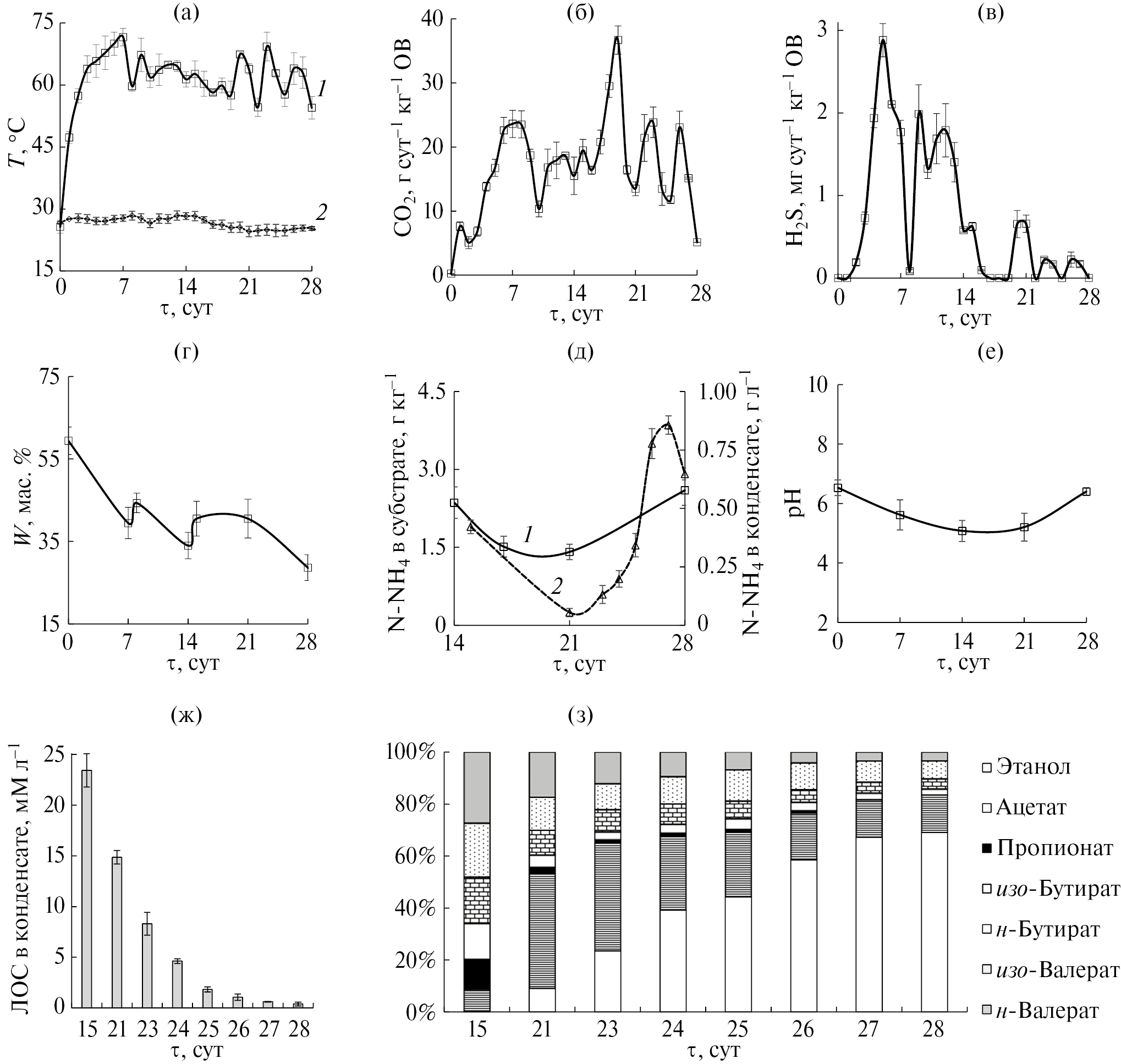 Рис. 4. Динамика изменения параметров компостирования в эксперименте по исследованию биодеградации ППК в составе пищевых отходов: температуры внутри камеры (1) и окружающей среды (2) (а), СО2 (б), H2S (в), массовой доли влаги в субстрате (г), содержания N–NH4 в субстрате (1) и конденсате (2) (д); рН субстрата (е), содержания (ж) и состава летучих органических соединений (ЛОС) в конденсате (з)
