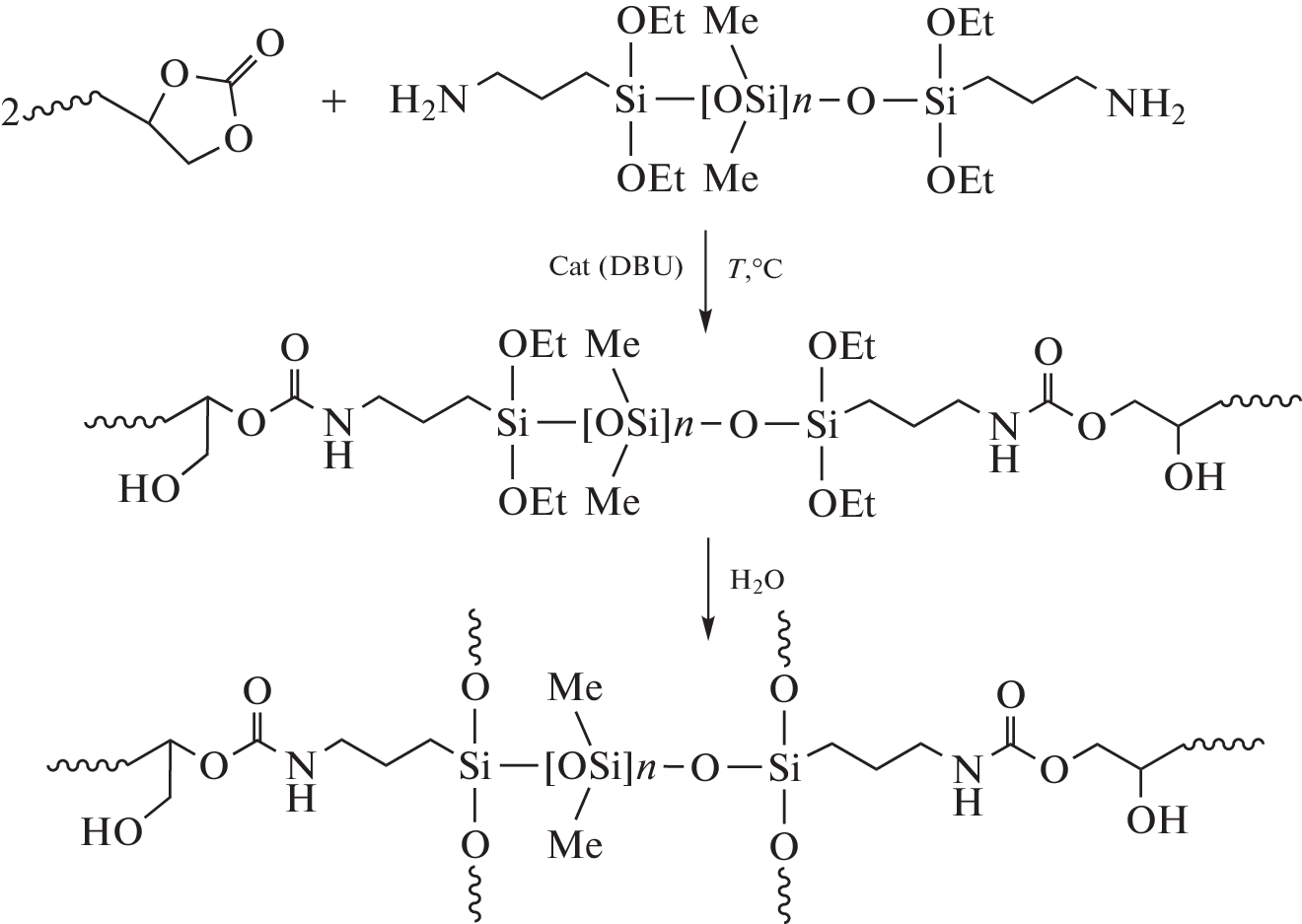 Environmentally friendly method for the synthesis of crosslinked poly(siloxane-urethanes) avoiding the use of toxic isocyanates has been presented. The synthesis has been performed in two stages: at the first stage, non-isocyanate poly(siloxane-urethanes) have been synthesized via aminolysis of cyclocarbonates (differing in the structure and functionality) with oligomer dimethylsiloxanes bearing aminopropyl and ethoxy substituents, and crosslinked non-isocyanate poly(siloxane-urethanes) have been obtained via hydrolysis of the ethoxy groups with air moisture. According to the TGA data, processes of thermooxidative decomposition of the non-isocyanate poly(siloxane-urethanes) begin at 240‒260°C, depending on the structure of the organic block. Structural organization of the films has been investigated and glass transition temperature of two blocks (flexible siloxane and rigid urethane ones) has been determined by means of DSC and TMA. Surface of the film samples of non-isocyanate poly(siloxane-urethanes) has been assessed by means of scanning electron microscopy.