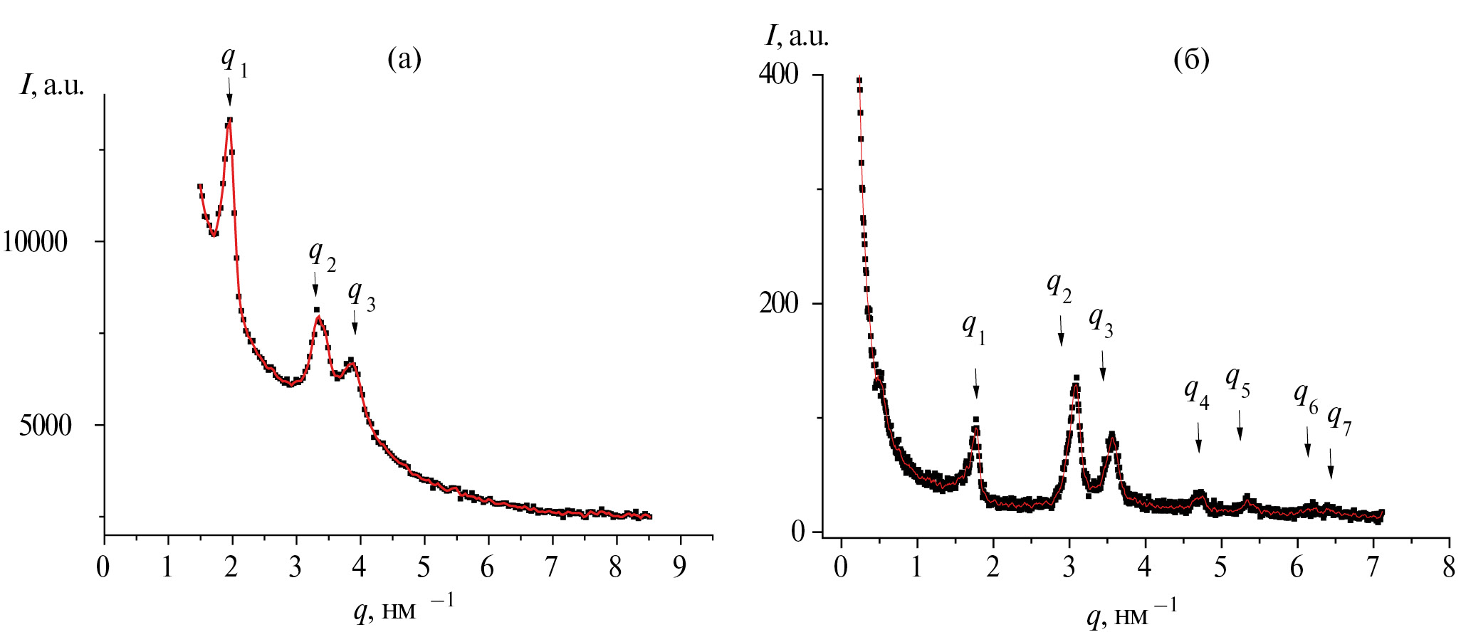 Рис. 1. Зависимости интенсивности рассеяния рентгеновских лучей от волнового вектора для ИПЭК состава pAMPS‒pAUTA, полученного смешением полиэлектролитов в этаноле (а), и пленки гребнеобразного полиэлектролита pAUTA-С4 (С4 – бутират), отлитой из раствора в метаноле (б) [20].