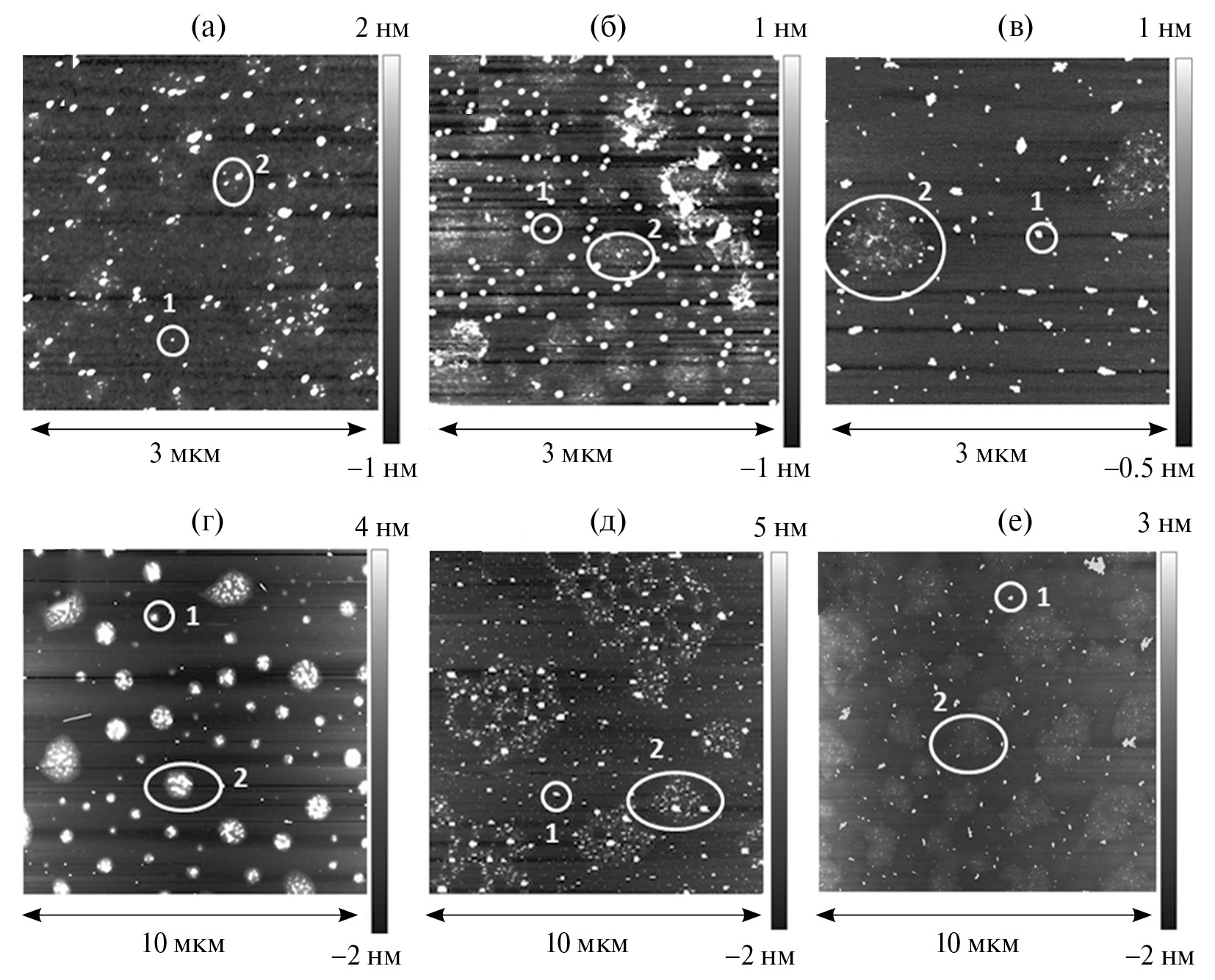 Рис. 4. АСМ-изображения дисперсий ИПЭК pAMPS‒pAUTA на слюде. Низкомолекулярные соли удалены диализом. Мw (Ð) исходного полиэлектролита pAMPS-Na: (а) ‒ 3800 × 103 (3.0), (б) ‒ 1460 × 103 (3.6), (в) – 702 × 103 (1.4), (г) – 660 × 103 (4.4), (д) ‒ 379 × 103 (1.4), (е) ‒ 149 × 103 (1.3).