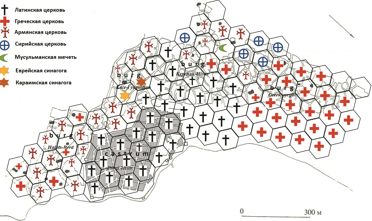 Как раз случай Каффы XIII–XV вв. предоставляет такую феноменальную возможность. Там на площади 120 гектаров [1, с. 202] трансформировались в единое городское сообщество пять протогородских субъектов: греческий пиргос, Айоц Берд (армянская крепость), Кале-и ягудиан (еврейская крепость), Кипчак-хисар (татарская крепость) и Френк-хисар (генуэзский каструм) [1, с. 218–256]. В общий поток городской жизни слились семь конфессий: греческая, армянская, сирийская, исламская, иудейская, караимская и латинская (Рис. 1) со своими иерархами, простиравшими каноническую юрисдикцию порой на весьма обширную территорию [1, с. 511–523], едва ли не всю Газарию, как в византийских и латинских официальных документах того времени обозначался весь татарский мир [1, с. 30].
