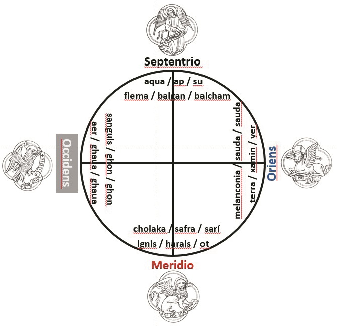 Четыре стихии, четыре первоэлемента мира – воздух (aer = ghaua = ghaua), огонь (ignis = harais = ot), земля (terra = xamin = yer) и вода (aqua = ap = su) [15, fol. 36r]. Они соответствовали четырем сторонам света: Запад, Юг, Восток и Север; отражали последовательную смену сезонов годового цикла: весну, лето, осень и зиму. Они соотносились еще и с христианской истиной, заключенной в четырех евангелиях: от Иоанна, Марка, Луки и Матфея, а значит и с четырьмя их символами – орла, льва, тельца и ангела (Рис. 2). Но самое поразительное, четыре стихии гармонировали с жизненными соками человеческого тела – кровью, желтой желчью, черной желчью и лимфой. А те, в свою очередь, определяли четыре характера человека, четыре его темперамента – сангвиник, холерик, меланхолик и флегматик. Природный универсум приходил в гармонию с человеком, как макрокосм с микрокосмом.