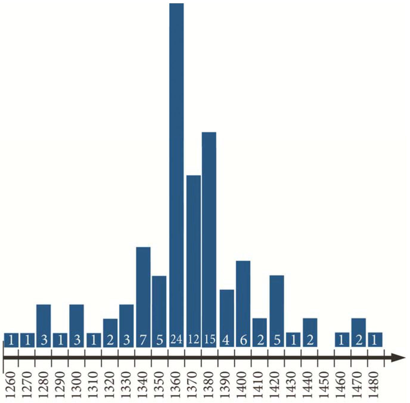 Плоские стелы также обычно устанавливались по два памятника на погребение, в изголовье – с именем, и в изножье – с датой. Плоские стелы можно разделить на несколько подтипов, отличающихся в основном по толщине плиты. Различные подтипы плоских плит-стел встречаются на всем исследуемом промежутке XIII–XV вв., но можно выделить период наибольшего всплеска появления таких памятников – 60-е гг. XIV в. (Рис. 4). Этот всплеск связан с подтипом самых тонких плоских женских стел со стрельчатым верхом (толщина плиты – 8–9 см), которые встречаются только в узком временном диапазоне 1360–1380-х годов. Так как распределение других типов надмогильных памятников практически равномерно, получается, что всплеск количества памятников 60–80-х гг. XIV в. связан в первую очередь с увеличением количества мужских восьмигранных стел и женских плоских стел.