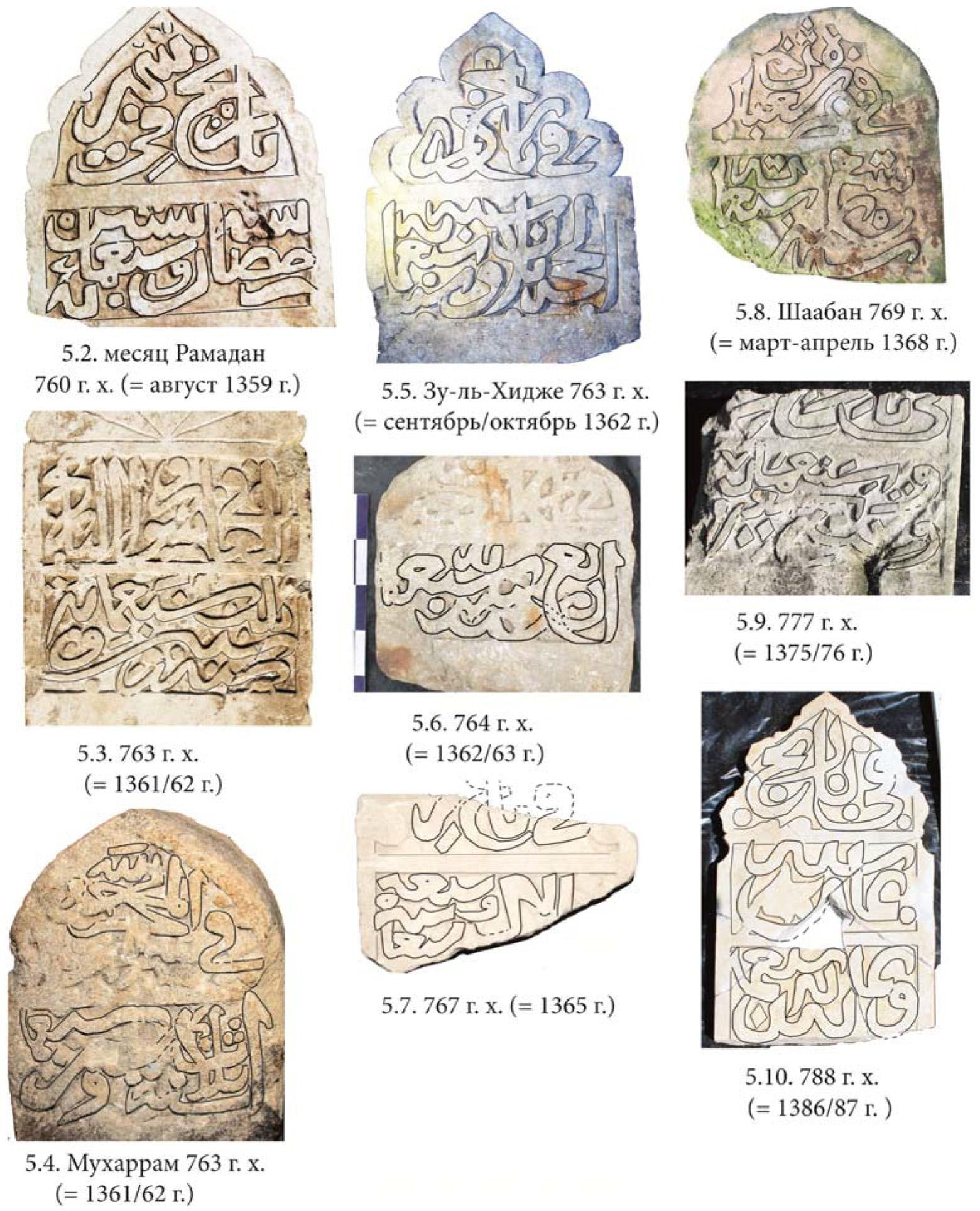 Можно отметить еще два небольших локальных пика увеличения количества памятников, которые приходятся на 776 г.х. (=1374/75 г.) – четыре мужских памятника, и на 782 г. х. (=1380/81 г.) – пять мужских памятников. Датированные памятники фиксируются без значительных перерывов в промежутке 1330-х – 1380-х гг., на протяжении более 60 лет. Пик приходится на 60–80-е гг. XIV в. В это время мусульманская община города, по-видимому, достигает своей максимальной численности.
