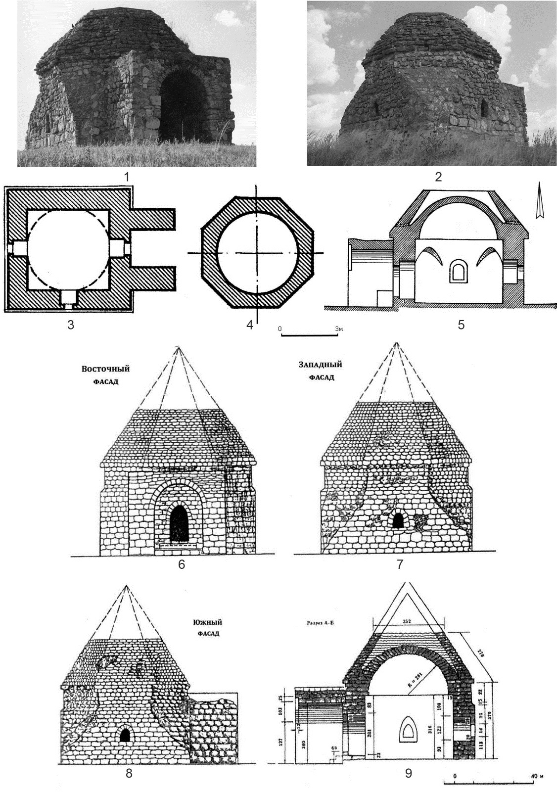 Fig. 1. Mausoleum of Tura Khan: 1 – facade; 2 – side view; 3 – plan; 4 – section of the drum; 5 – longitudinal section (3-5 by [21]); 6 – eastern facade; 7 – western facade; 8 – southern facade; 9 – longitudinal section (6-9 by [14])