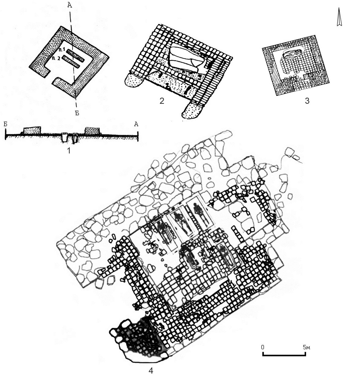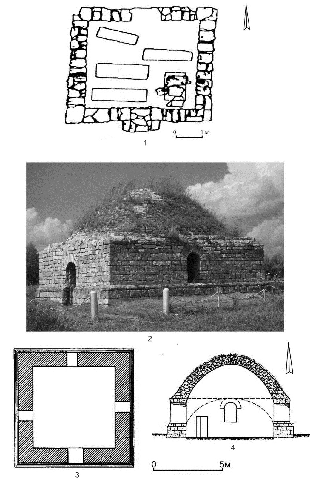 Fig. 2. Stone mausoleums: 1 – Small keshene; 2 – Husein-bek mausoleum, general view; 3 – plan; 4 – section (2-3 by [14])