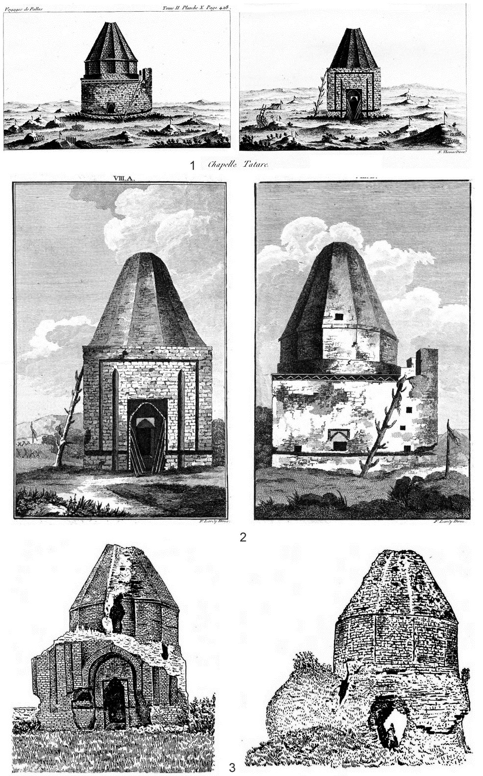 Fig. 3. Kesene Mausoleum: 1 – lithograph (N. Thomas Dirac) from collected works of P.S. Pallas, 1789–1793; 2 – lithograph (F. Lardy Dirac) from collected works of P.S. Pallas, 1795; 3 – photograph by engineer Pod’iakonov, 1908 (by [23])