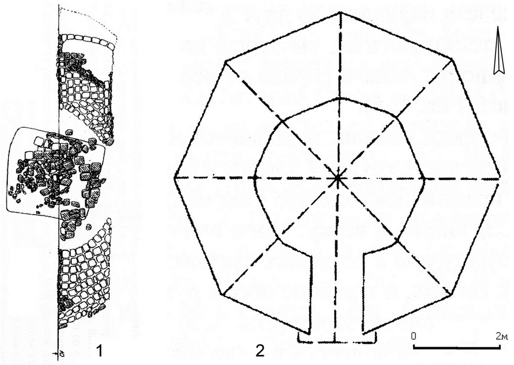 Fig. 8. Mausoleum near the village of Izobilnoe: 1 – plan; 2 – reconstruction of plan (by [13])