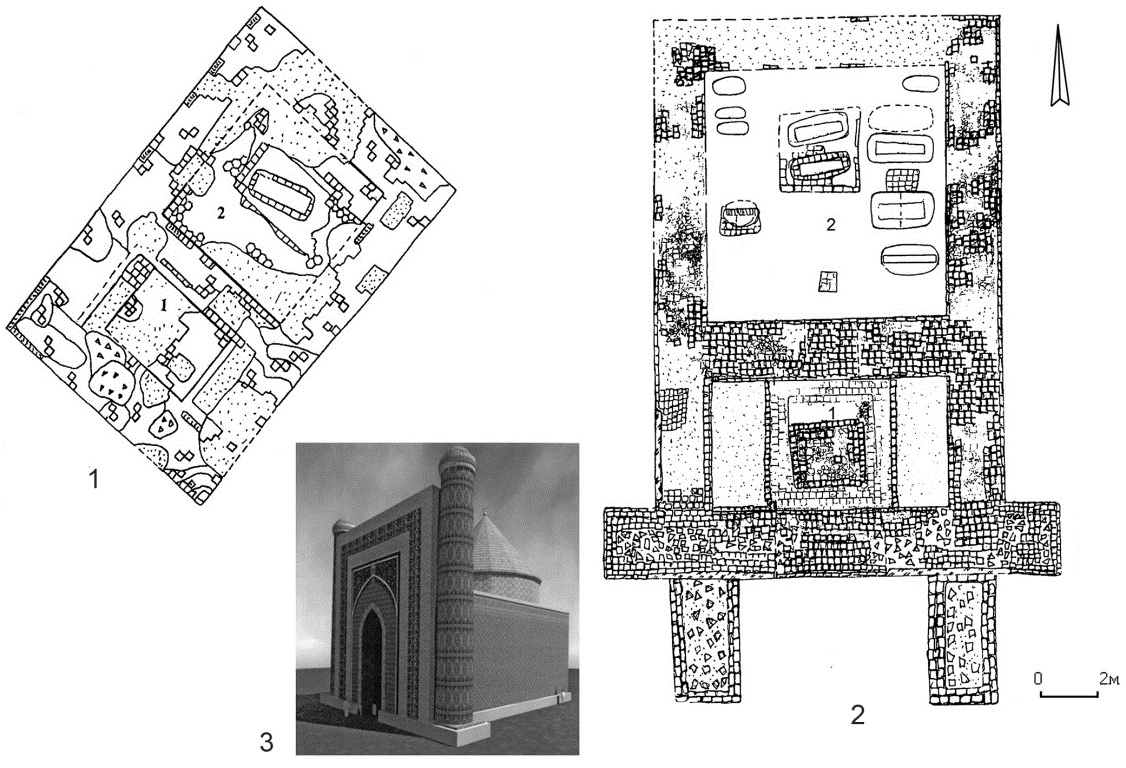 Fig. 9. Mausoleums of Zhaiyk: 1 – Lesser Mausoleum; 2 – Great Mausoleum; 3 – reconstruction option for the Great Mausoleum (by [3])