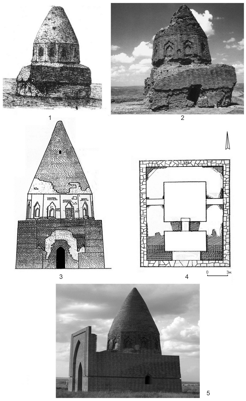 Fig. 11. Mausoleum Abat Baytak: 1 – drawing from the beginning of the 20th century [23]; 2 – photo before restoration; 3 – graphic reconstruction; 4 – plan [2]; 5 – modern look