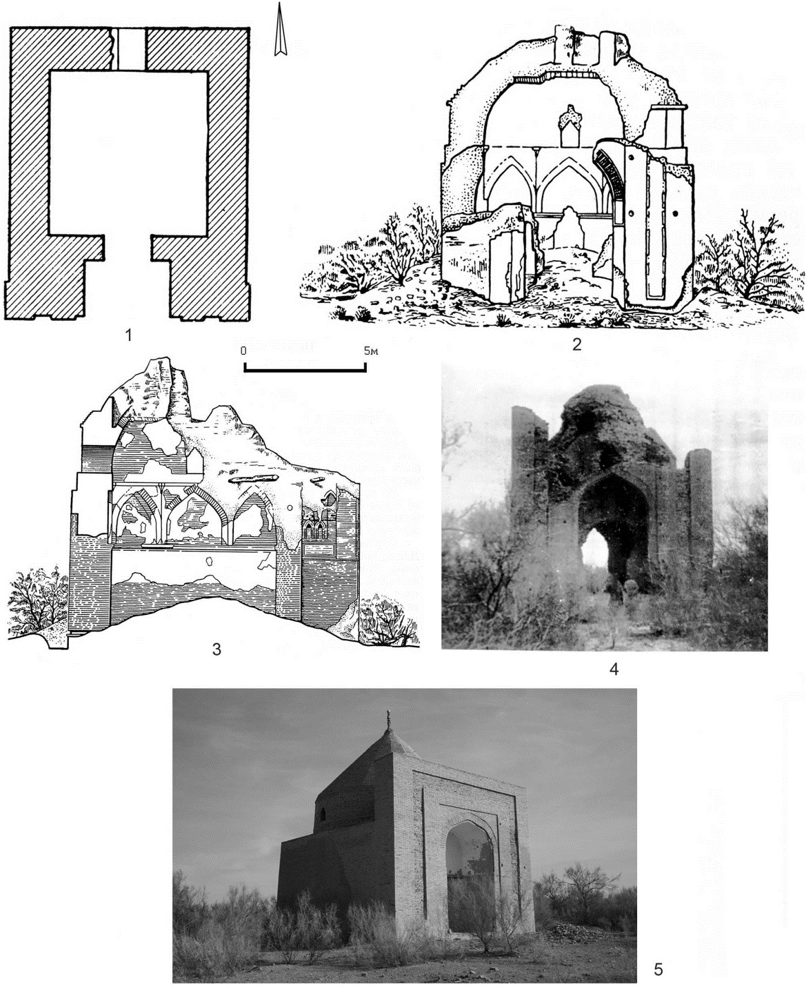 Рис. 11. Мавзолей Абат Байтак: 1 – рисунок начала XX в. [23]; 2 – фото до реставрации; 3 – графическая реконструкция; 4 – план [2]; 5 – современный вид