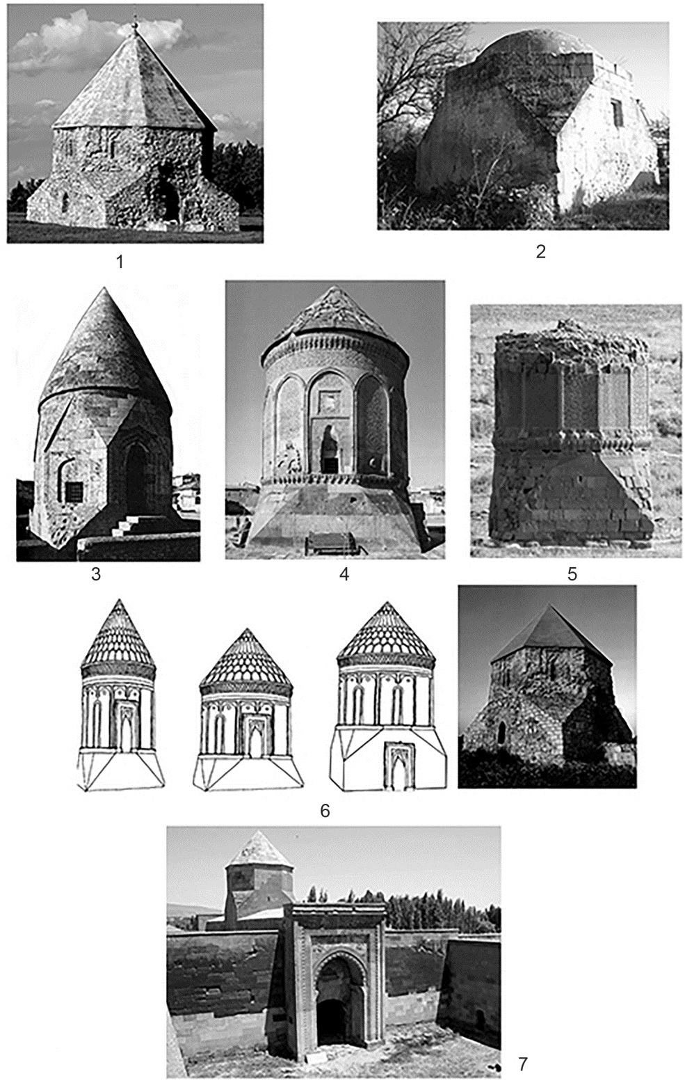 Fig. 14. Stone mausoleums with a square base in plan: 1 – Eastern in Bolgar; 2 – Bey Yude Sultan in Aziz; 3 – Melik Gazi in Aksehir; 4 – Doner Kumbet in Kayseri; 5 – Gulistan near the Juga village; 6 – diagram of the transformation of the Asia Minor tower mausoleum into the Bulgarian one; 7 – caravanserai of Karatai Khan
