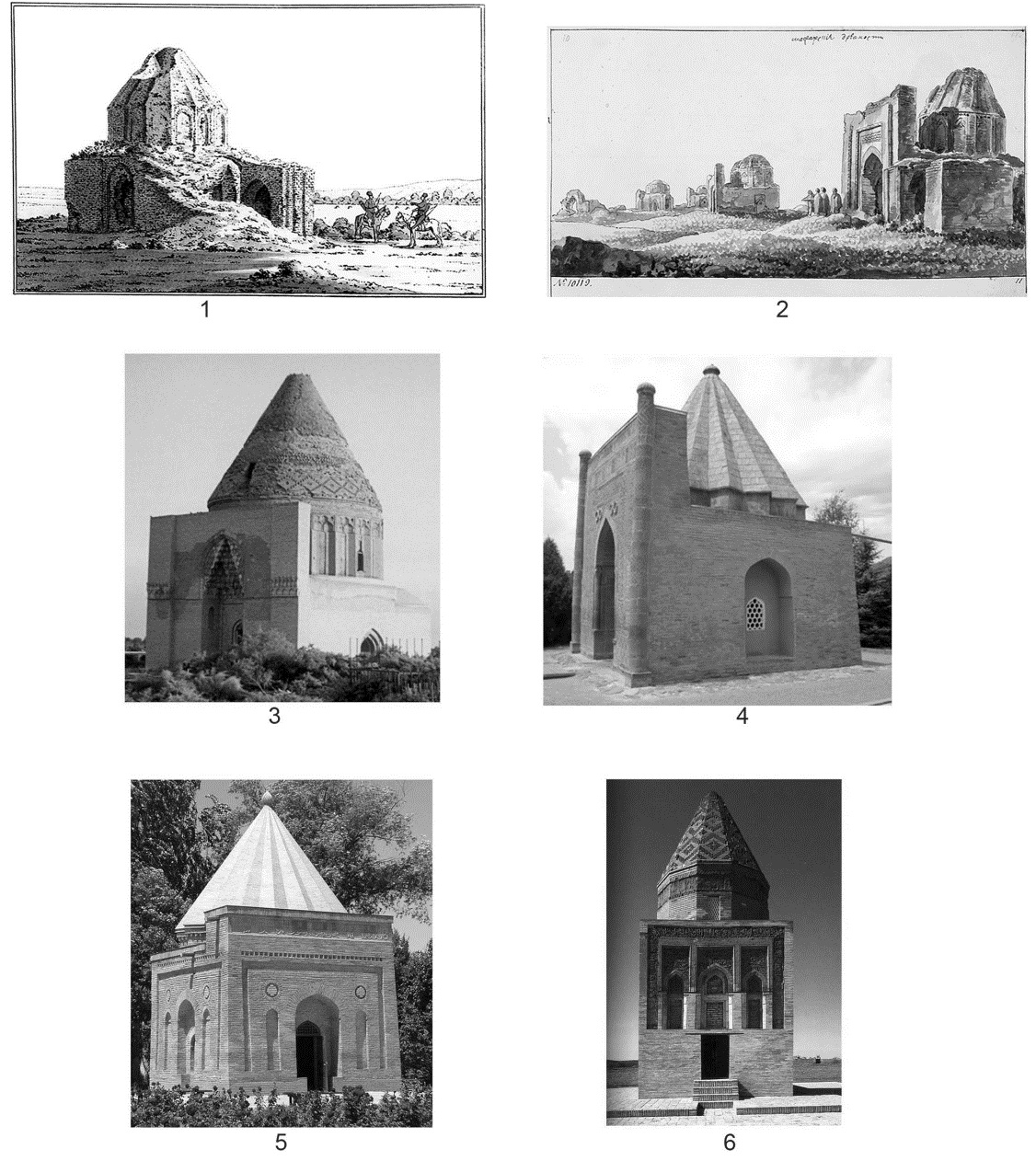 Fig. 15. Brick tented mausoleums: 1 – Majar, fig. by K. Geisler; 2 – Majar, fig. by M.M. Ivanov; 3 – Sultan Tekesh in Kunya-Urgench; 4 – Manas in Kyrgyzstan; 5 – Babaja-khatun in Taraz; 6 – Fakhraddin Razi in Kunya-Urgench