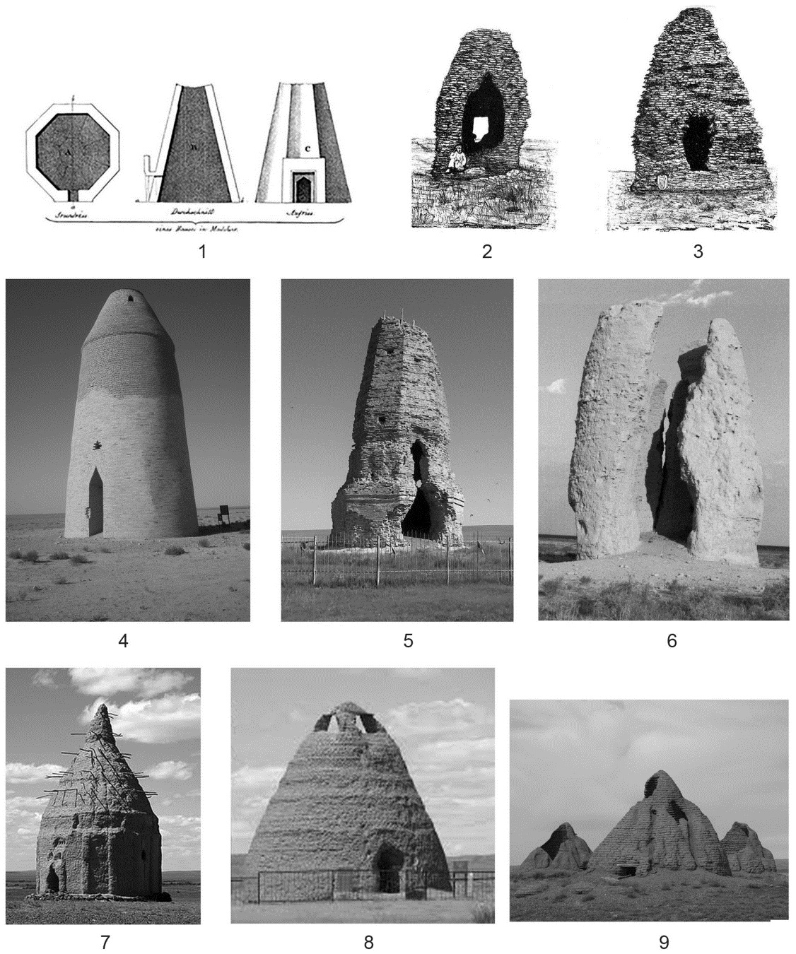 Fig. 16. Pyramid burial and memorial buildings: 1 – in Majar; 2 – Dyngek in Semirechye; 3 – Kozu Korpech in Semirechye (2-3 by [23]); 4 – Saraman-kosa; 5 – Begim-ana; 6 – Uzyntam (4-6 in the Lower Syrdarya); 7-9 – in the necropolises of Central, Southern and Western Kazakhstan