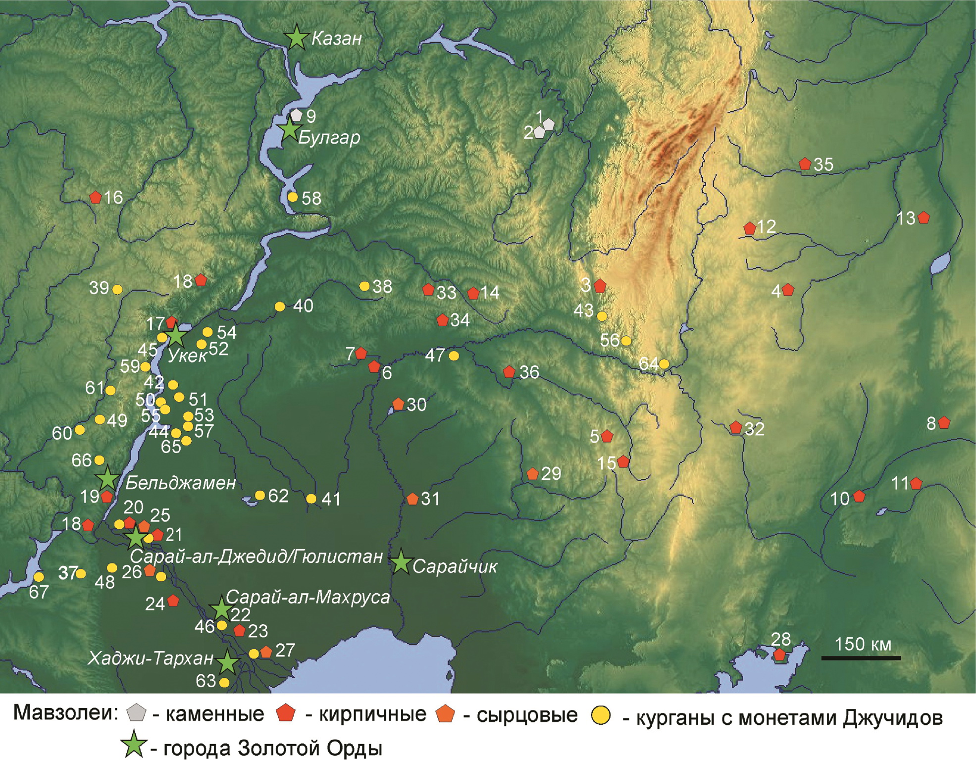 Таким образом, мавзолеи в степях Заволжья и Южного Предуралья начинают сооружаться в XIV в., и едва ли ранее правления хана Узбека. То есть, ещё в то время, когда среди золотоордынских кочевников продолжала устойчиво сохраняться языческая погребальная обрядность. Что подтверждается довольно многочисленными в регионе находками кочевнических подкурганных захоронений с вещами и джучидскими монетами (рис. 1). Причем, абсолютное большинство монет чеканены в 1340–1360-е гг. [47].