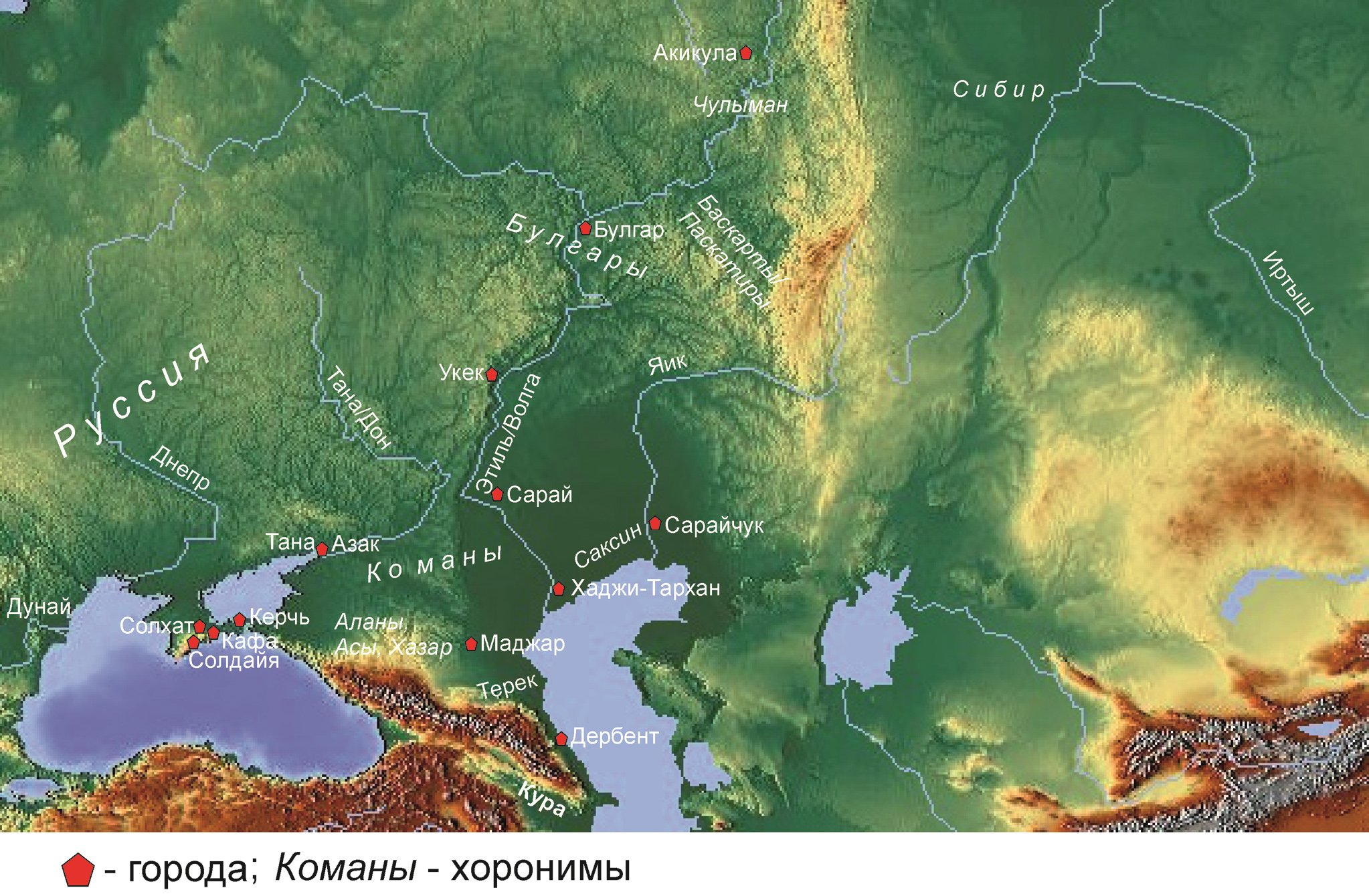 Перечень урбанонимов так же немногочисленный и довольно «стандартный». Чаще всего нарративисты XIV в. называли Солдайю/Судак, Кафу, Железные ворота/Дербент, Сарай, Булгар и Укек. Реже – Солхат, по одному разу Чуфут-Кале, Керчь, Маджар, Хаджи-Тархан и Сарайчик. Опять-таки, со слов Хасана Эрруми ал-Омари называет «касабу» Акикула, расположенную у пределов Сибира, Ибира и Чулымана [10, с. 107].