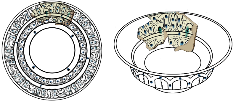 The analysis of completely preserved bowls reveals that a certain typical, generalized form of decoration of glazed vessels has been developed and the principle of decoration is the same in all cases, namely: the outer surface of the bowls is decorated with a relief rose decorated with blue dots and an arched ornament attached to the upper edge of the vessel. Rose petals are divided into two parts by a chain of vertical short lines; The interior design scheme is different. It can be said that it is too decorative and overloaded, but this does not prevent it from being harmonious and balanced at the same time. The inner rim is characterized by the uniformity of the ornamentation of the skirts (ornamented belts, concentric circles), while the base of the vessel is distinguished by a different compositional solution (Fig. 3). The inner surface is divided into zones by alternating concentric circles, decorated belts and a central composition. In each zone, the elements are arranged according to a certain rhythm: