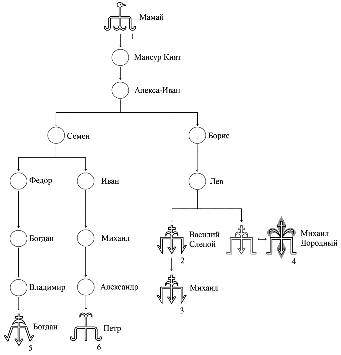 В родословных книгах разных редакций родословная роспись князей Глинских представлена в нескольких вариантах [6, с. 271–292; 38, с. 319–352]. Отличаясь в ряде деталей, они производят князей Глинских от эмира1 Мамая, правившего от имени ряда ханов-марионеток на территории между Волгой и Днестром, на Северном Кавказе и в Крыму [7, с. 276–287].