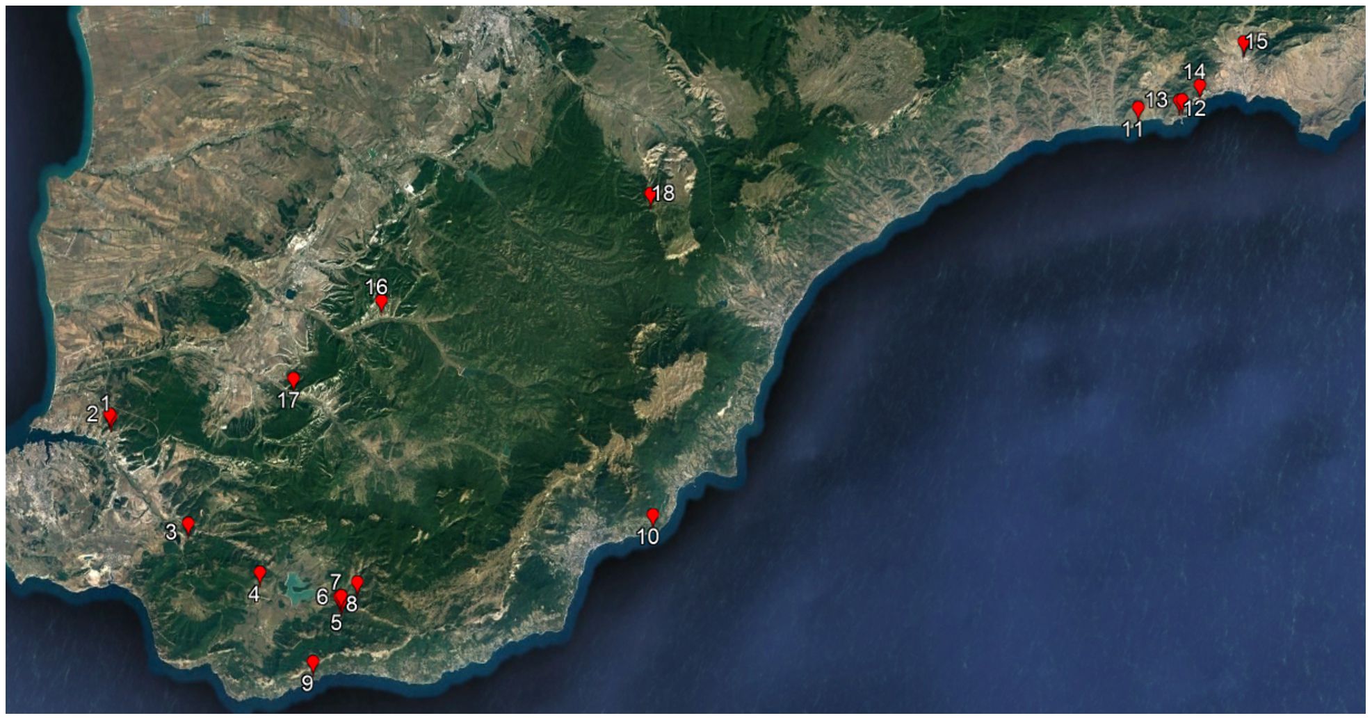 (1-2 – окрестности г. Инкерман; 3 – г. Чирка-Каясы; 4 – г. Самналых; 5 – г. Толака-Баир; 6–8 – г. Кара-Даг; 9 – г. Дракон; 10 – м. Мартьян; 11 – г. Папая-Кая; 12–13 – г. Коба-Кая; 14 – г. Сокол; 15 – г. Каршитерс; 16 – ск. Куллю-Кая; 17 – окрестности с. Кудрино; 18 – г. Чатыр-Даг)