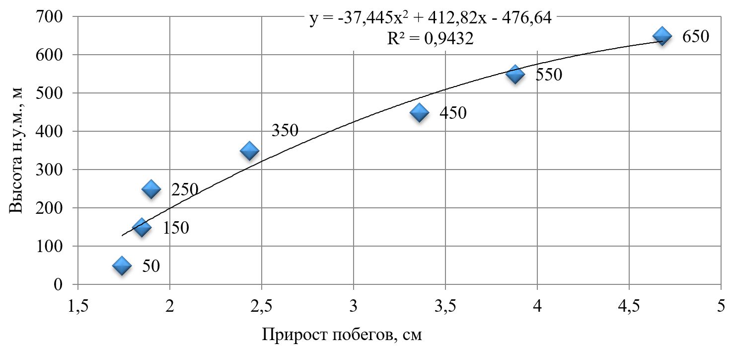 С использованием дисперсионного анализа установлено, что сила влияния фактора (высоты над уровнем моря) в 2021 г. составила 52,9 % (Fф=12,83; Fst при 1%=2,87), в засушливые годы – 24-26% (Fф=4,06-5,36). Выявлено, что с повышением высоты над уровнем моря наблюдается увеличение годового прироста побегов, коэффициент корреляции составил 0,94 (рис. 3).