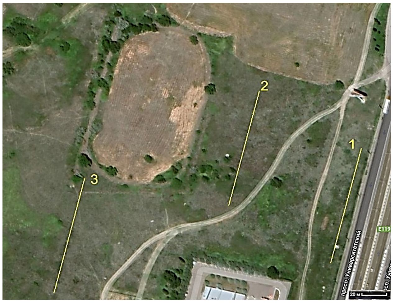 Расположение почвенных ловушек на полигоне «ТЭЦ-3» представлено на рисунке 3. Древесная растительность полигона ТЭЦ-3 представлена тополем чёрным (Populus nigra L.) и вязом (Ulmus sp.), травянистая – полынями (Artemisia spp.), прутняком (Bassia prostrata (L.) Beck), житняком (Agropyron cristatum (L.) Gaertn.), пыреем (Elytrigia repens (L.) Nevski).