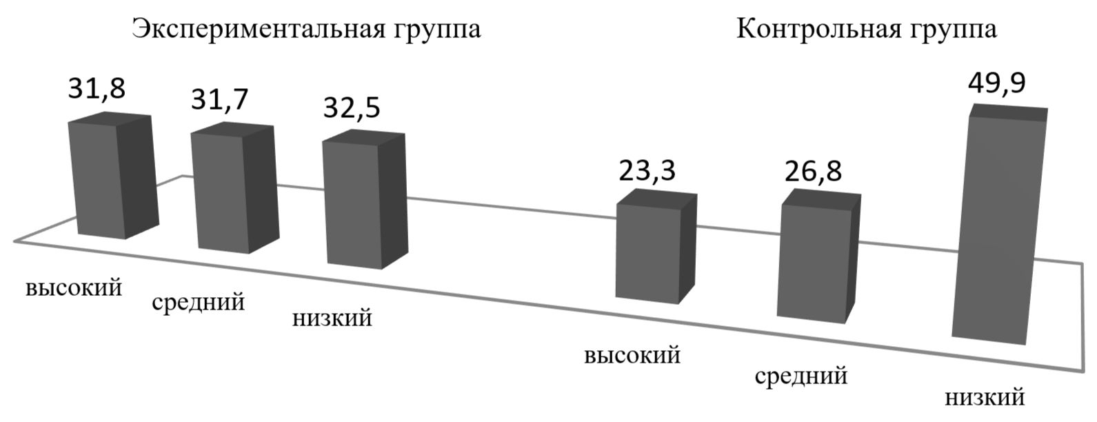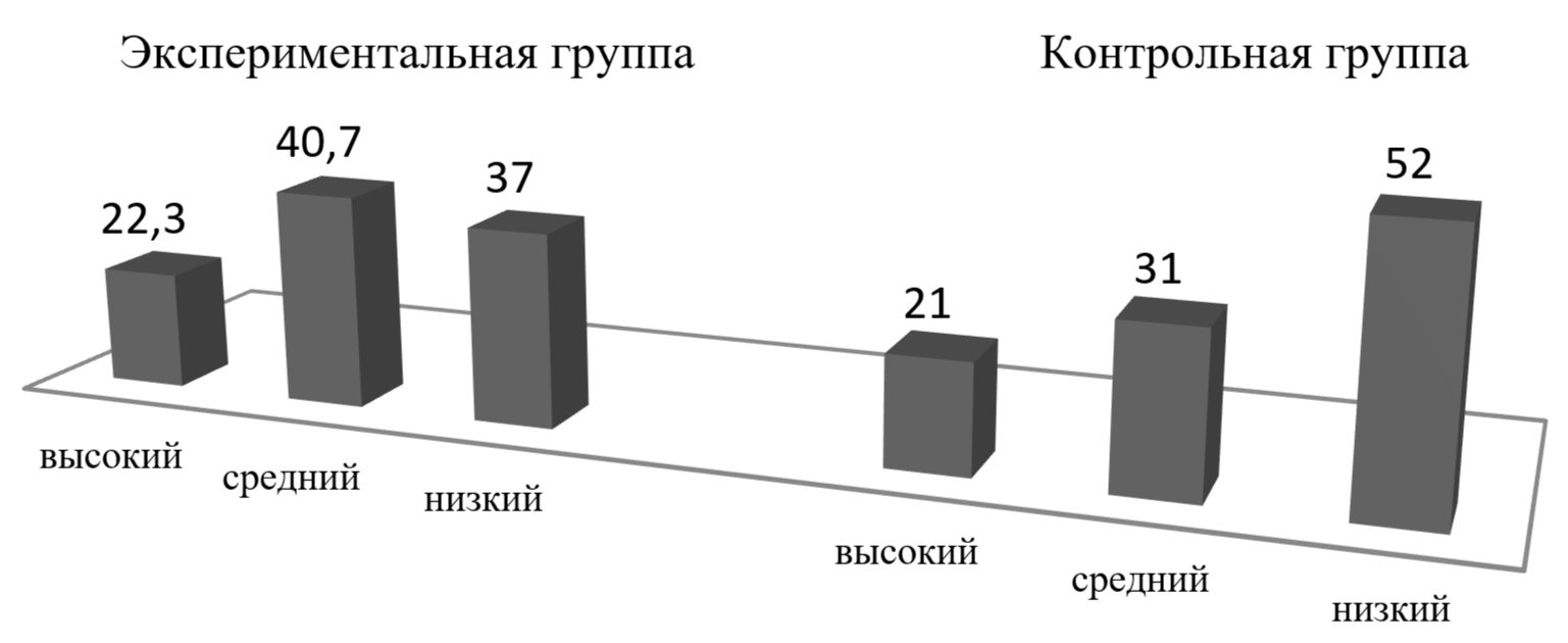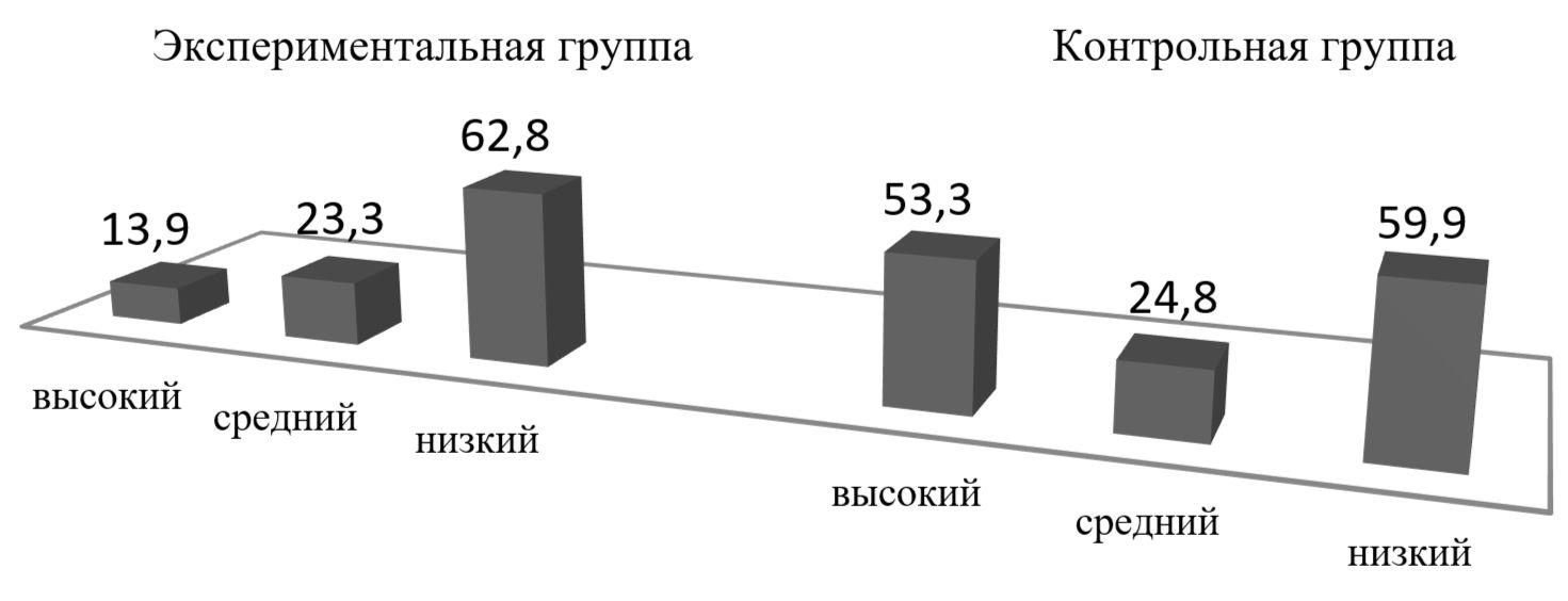 На диаграмме 1 представлены уровни сформированности иноязычных умений у студентов после выполнения творческих заданий. Он был не высокий (63,5% в экспериментальной и 62,8% – контрольной группе).
