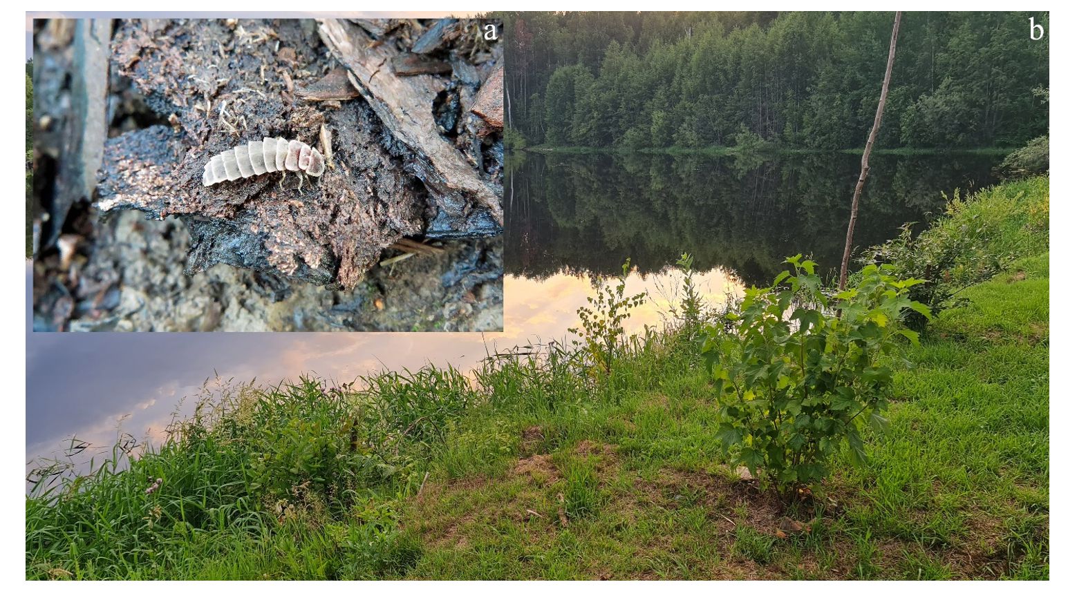 С 7 по 20 июля 2022 г. мы работали в низовьях р. Кума – в 9 км к западу от д. Старый Катыш (рис. 1 – точка 6). На злаковом антропогенном лугу (59° 29,400' с.ш., 66° 42,000' в.д.) (рис. 2b) размером порядка 50×50 м, примыкающем к левому берегу реки и окруженном осиново-березовым лесом, в ночь на 12 июля зарегистрировали 3 самки. Одно насекомое (рис. 2a) сидело на поверхности почвы, обнажившейся в результате перекопки человеком небольшого приграничного участка, второе насекомое находилось на деревянном настиле, третье – на ветке молодого куста смородины. Попытки отыскать других жуков в следующие дни результатов не дали. Респондент О.Г. Мурашина, побывавшая здесь 12 июня 2021 г., сообщила о наблюдении в ночное время нескольких обыкновенных светляков, очевидно, самок. О.А. Мурашин из беседы с жителями пос. Междуреченский узнал о находках вида в ближайших окрестностях этого населенного пункта (рис. 1 – точка 5).